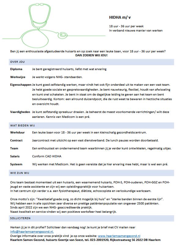 In verband met een nieuwe manier van werken, is er plek vrij voor 1 of 2 huisartsen (HIDHA’s totaal 27-54 uur/ week) om dit samen met mij vorm te gaan geven. Het is een fijne, goed georganiseerd en geoutilleerd NPA-geaccrediteerde praktijk (2500 patiënten) met een hecht en positief ingesteld team. De sfeer is informeel en collegiaal.
